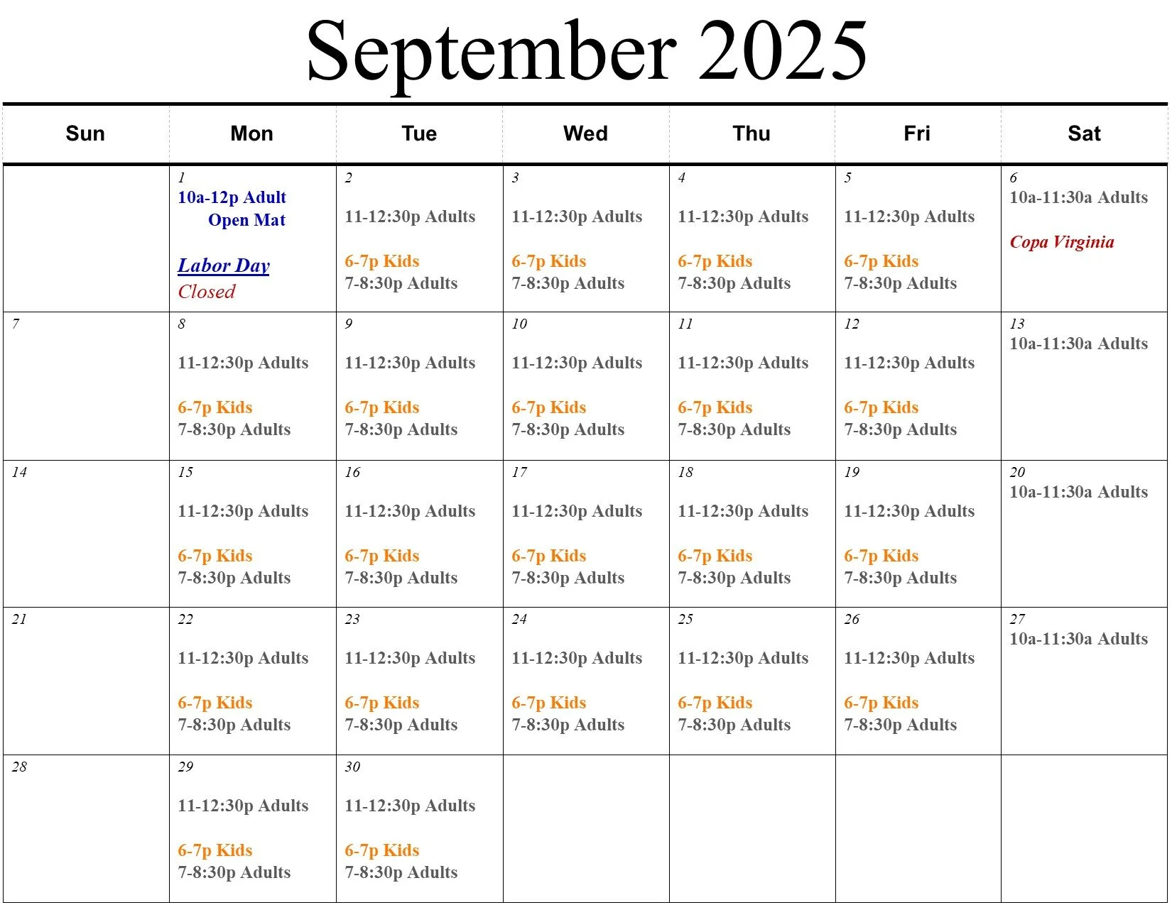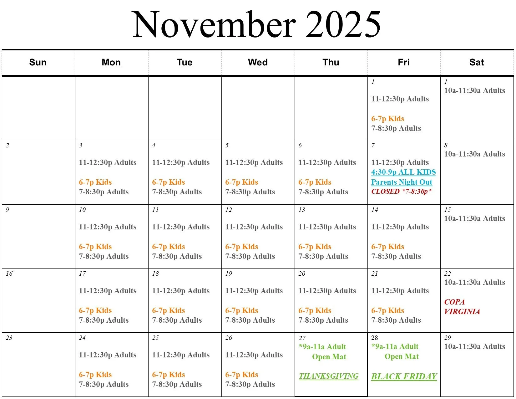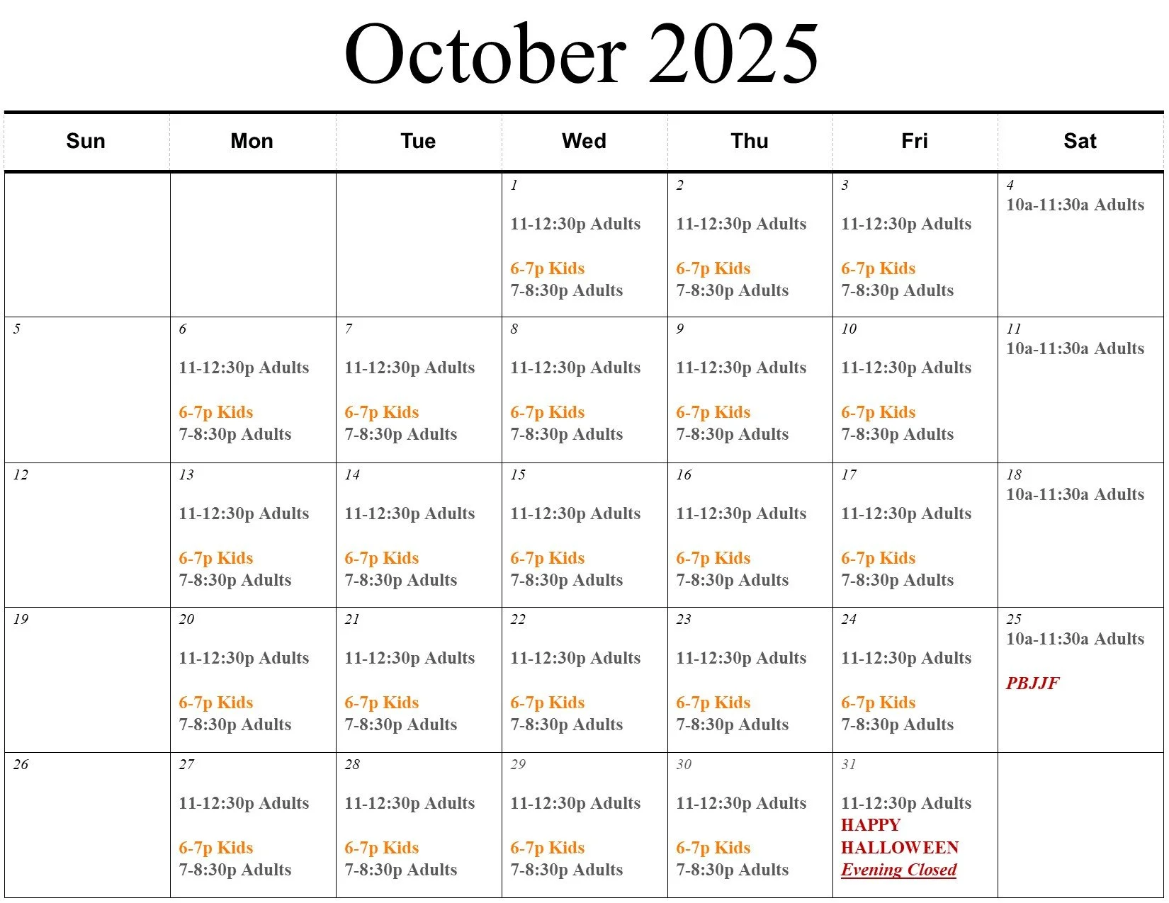 We offer classes mid-mornings and evenings Monday’s-Friday’s as well as Saturday’s. Our adult program is offered to all levels and is meant to accommodate different schedules in hopes to increase your availability to train. If you would like to schedule a trial class to see if this is something for you, please do so here. We are happy to answer any questions you may have; please just send us an email and we will get back to you.